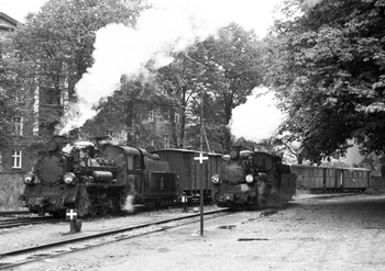 Pocztówka reklamowa 21x14,8 cm - Parowozy wąskotorowe Px48-3912 i Px48-3914 - Stargard Szczeciński 1979 r.